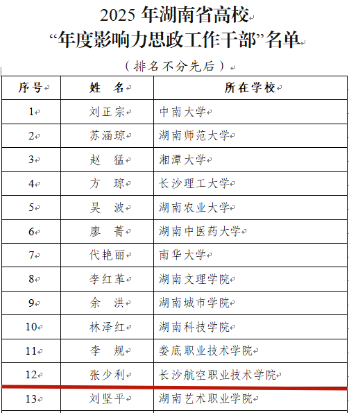 近日,湖南省教育厅与湖南中南传媒公益基金会联合公布了湖南省学校思政教育奖励基金年度影响力人物推选结果,我院思政工作党总支书记、政治部副主任张少利入选2025年湖南省高校“年度影响力思政工作干部”,我院电子学院电气自动化技术专业2204班于辉龙同学入选2025年湖南省高校“年度影响力大学生”。